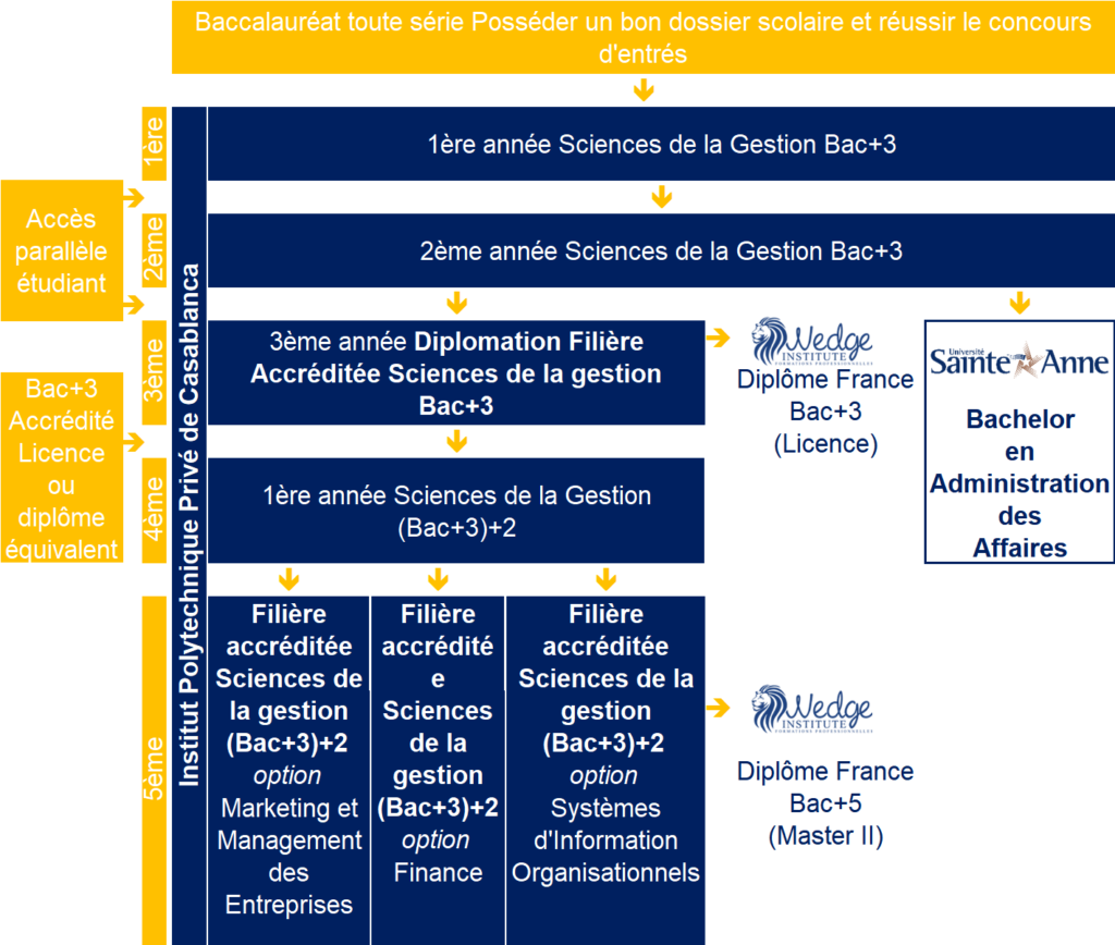 Après avoir validé tes deux premières années communes sur notre campus à Casablanca, tu auras la liberté de continuer ton parcours dans la filière accréditée Sciences de la Gestion au Maroc ou de t’envoler pour le Canada, où tu auras un accès direct au programme baccalauréat en administration des affaires de l’Université Sainte-Anne. En complétant tes études au Canada, tu auras l’opportunité de te voir décerner un grade de Bachelor canadien.